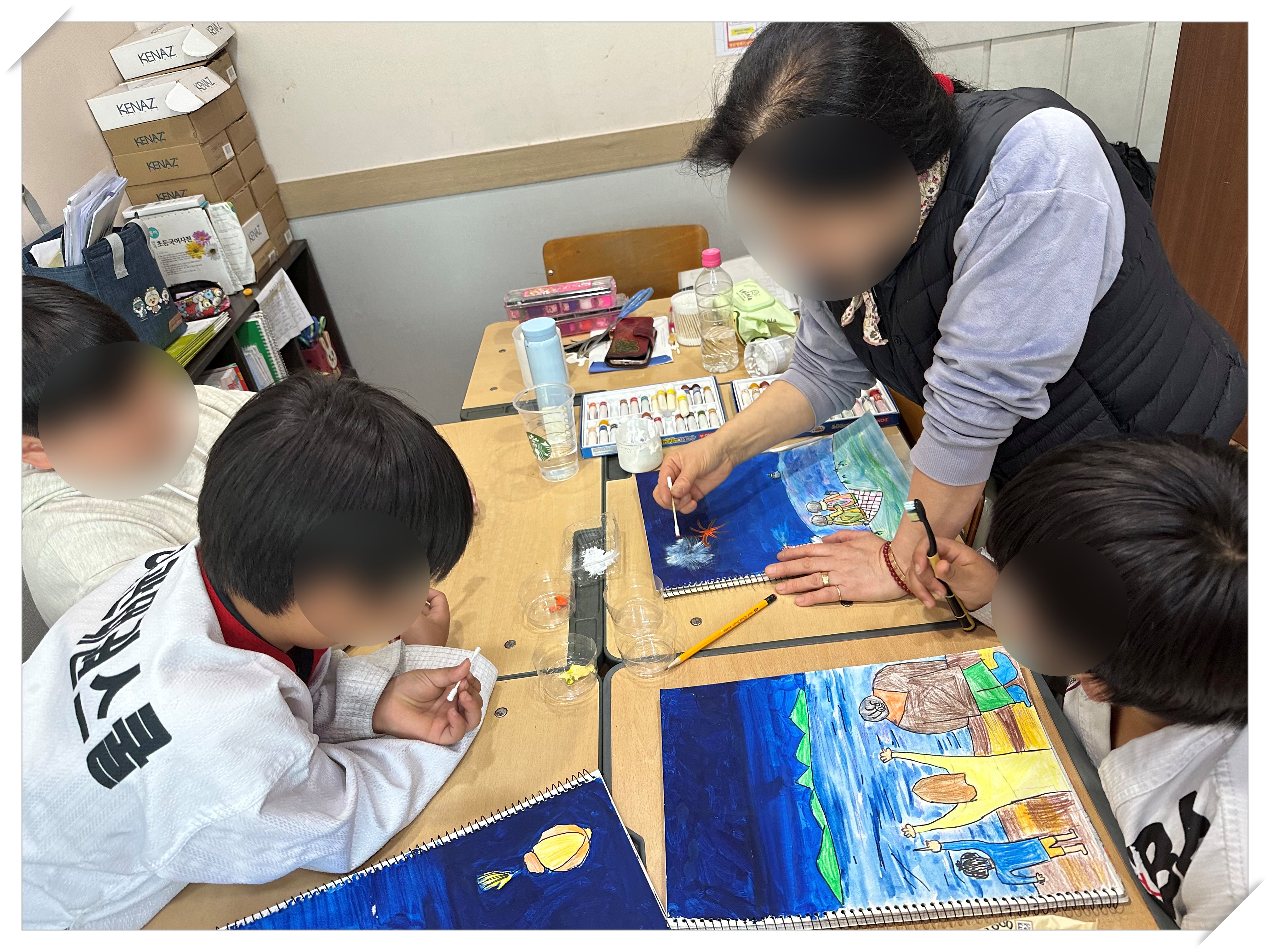 창의미술프로그램을 진행했습니다.칫솔, 면봉 등 도구를 사용하여 폭죽을 표현해보는 시간을 가졌습니다 ^^