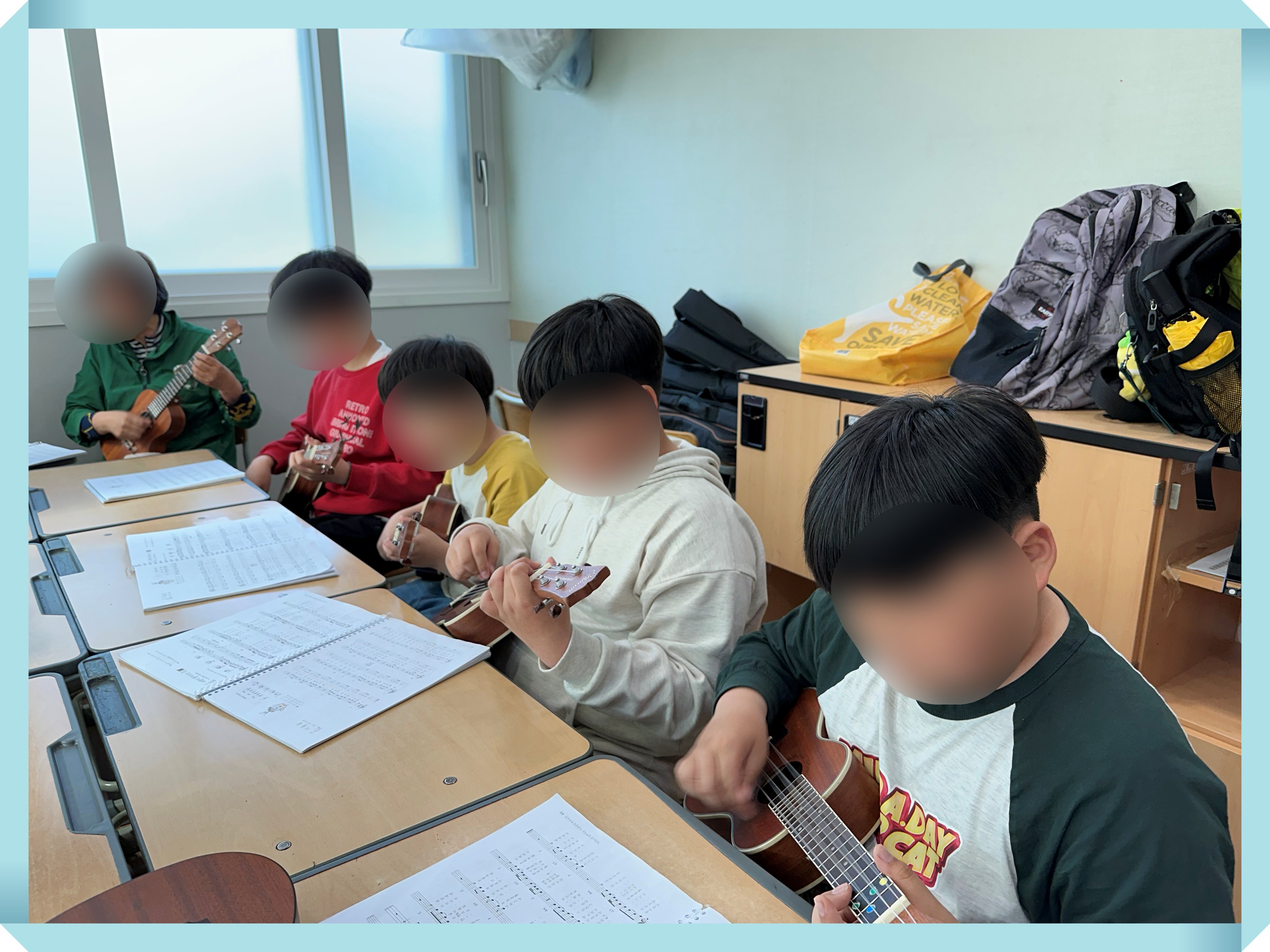 음악(우쿨렐레) 수업을 진행했습니다. ^^선생님께서 1:1 지도도 병행해 주셔서 아이들의 실력이 점점 향상되고 있는 모습...
