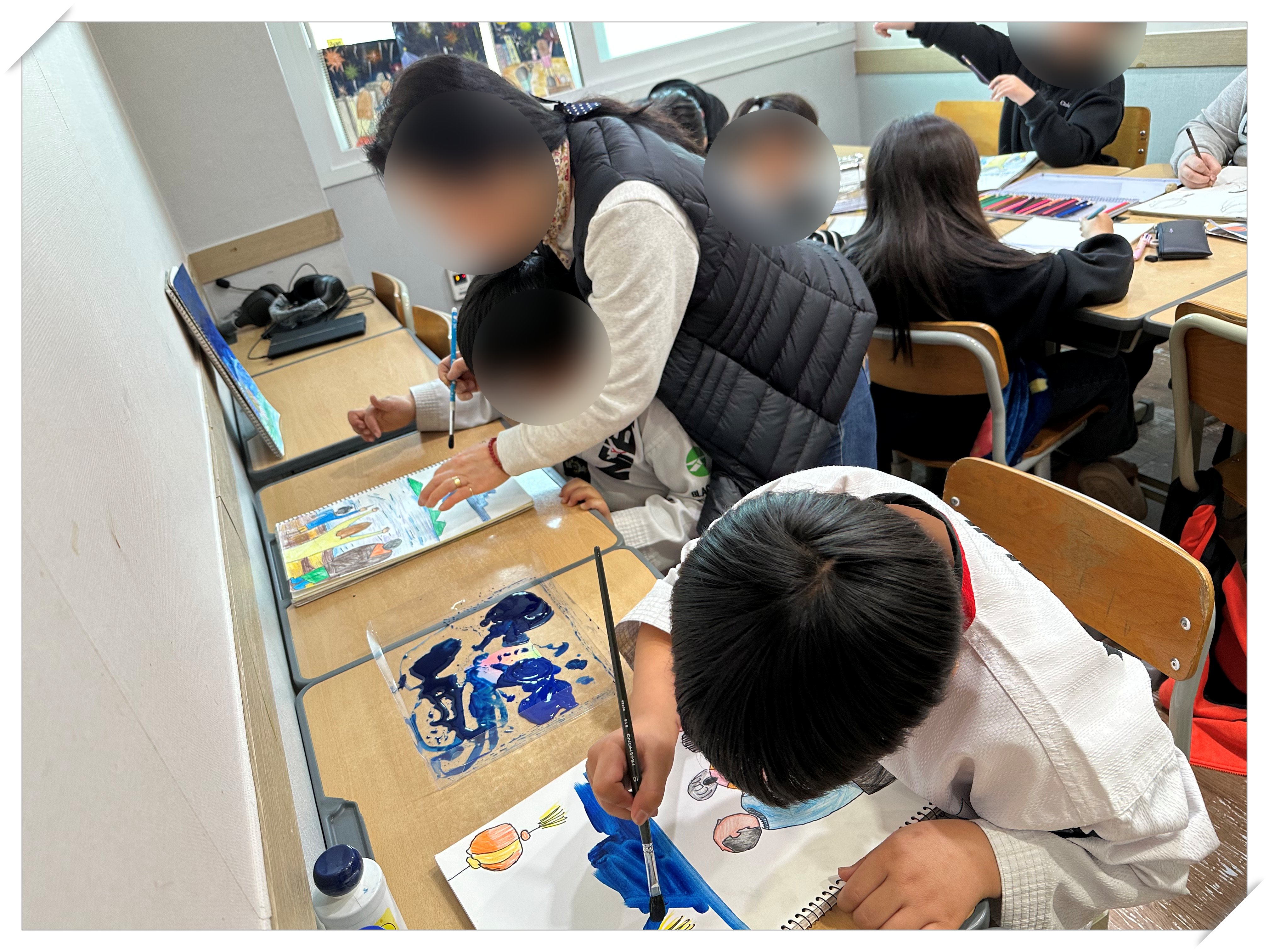 창의미술프로그램을 진행했습니다. 저번 주에 그린 그림에 바탕색을 칠해보며 또 하나의 작품을 완성해 나가고 있습니...