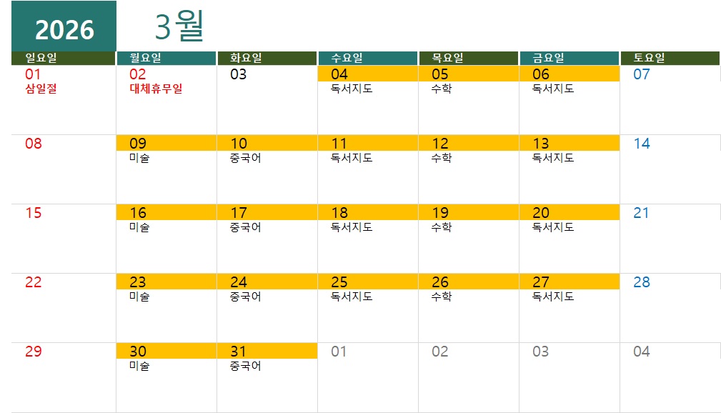 * 센터의 사정에 따라 변경될 수 있습니다. * 매주 공부하는 과목입니다.월- 미술 &n...