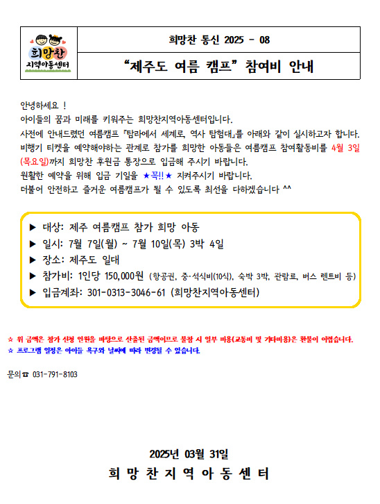 25. 03. 21 _8 '제주도 여름캠프' 참여비 안내