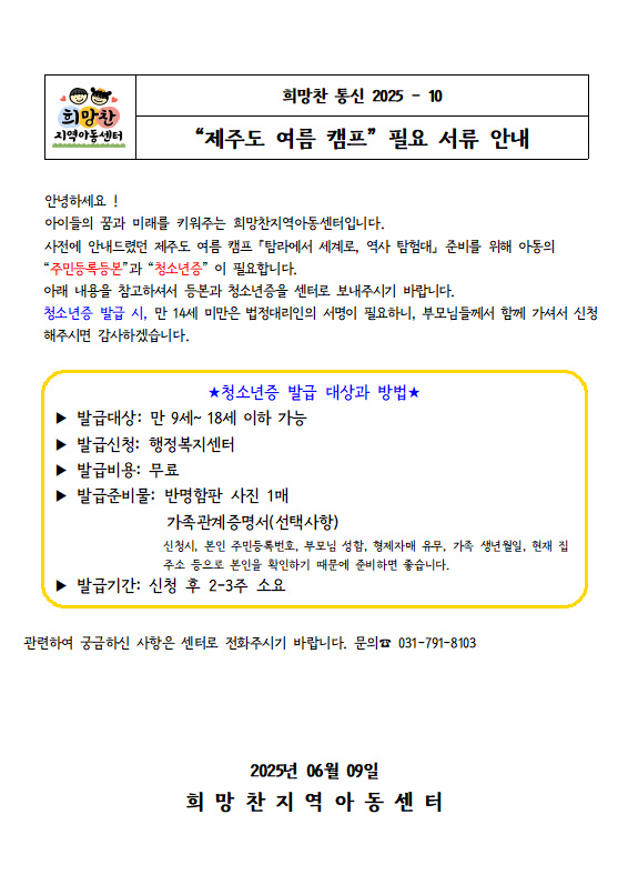 25. 06. 09 _10 '제주도 여름캠프' 필요 서류 안내