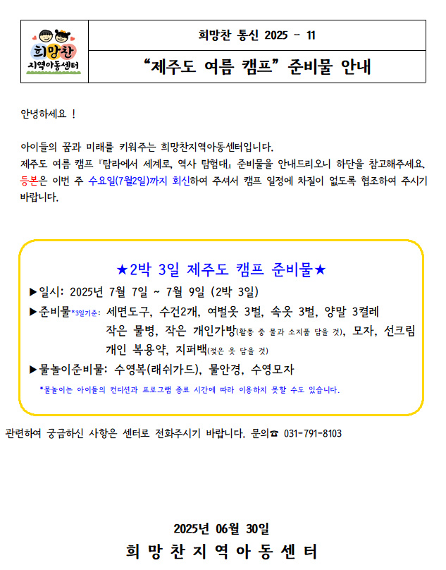25. 06. 30 _11 '제주도 여름캠프' 준비물 안내