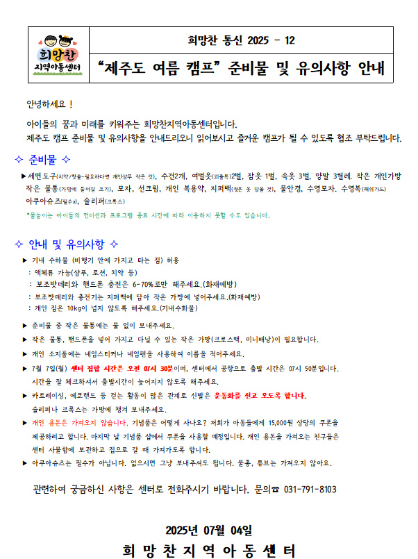 25. 07. 04 _12 '제주도 여름캠프' 준비물 및 유의 사항 안내
