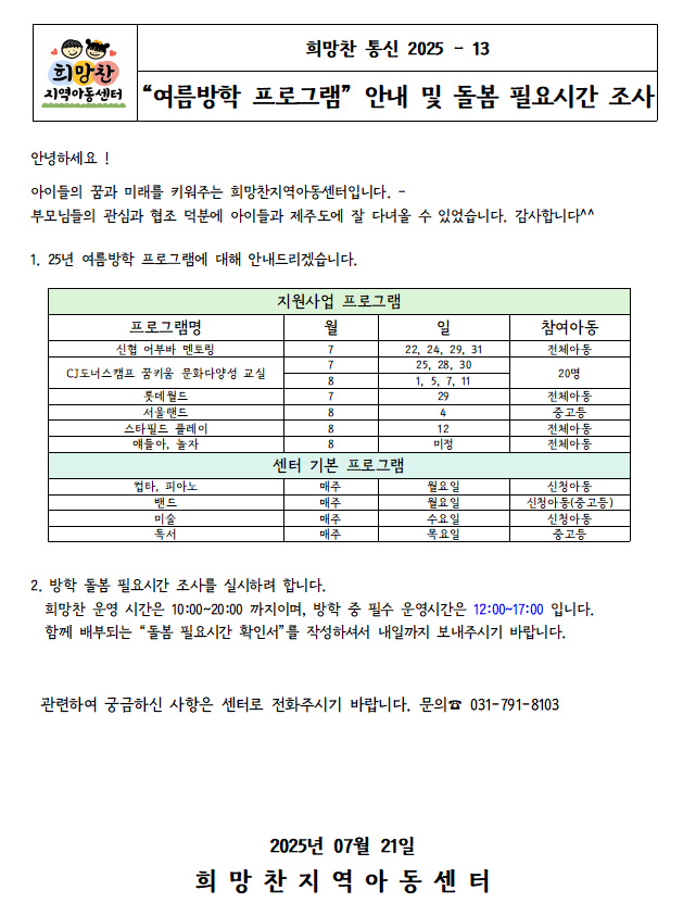 25. 07. 21 _13 '여름방학 프로그램' 안내 및 돌봄필요...
