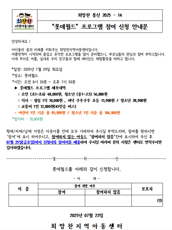 25. 07. 23 _14 '롯데월드 프로그램 참여 신청 안내문'