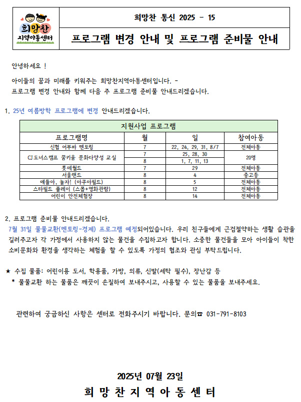 25. 07. 23 _15 '프로그램 변경 안내 및 프로그램 준비물...