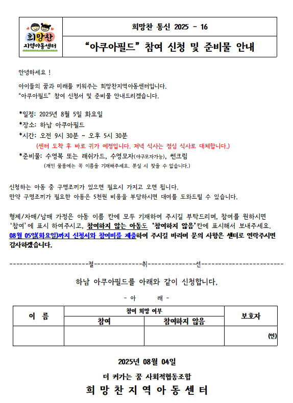 25. 08. 04 _16 '아쿠아필드 참여 신청 및 준비물 안내'