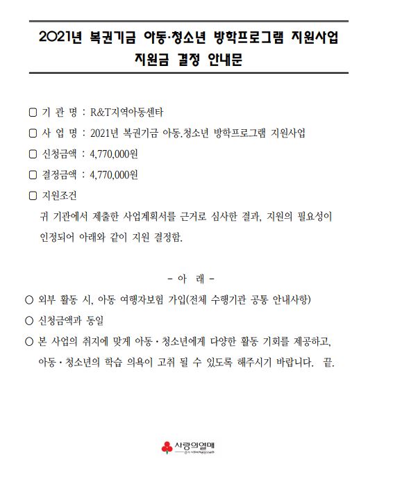 2021. 07. 05일 경축 2021년 복권기금 방학프로그램 지원사업에 선정이 되었답니다