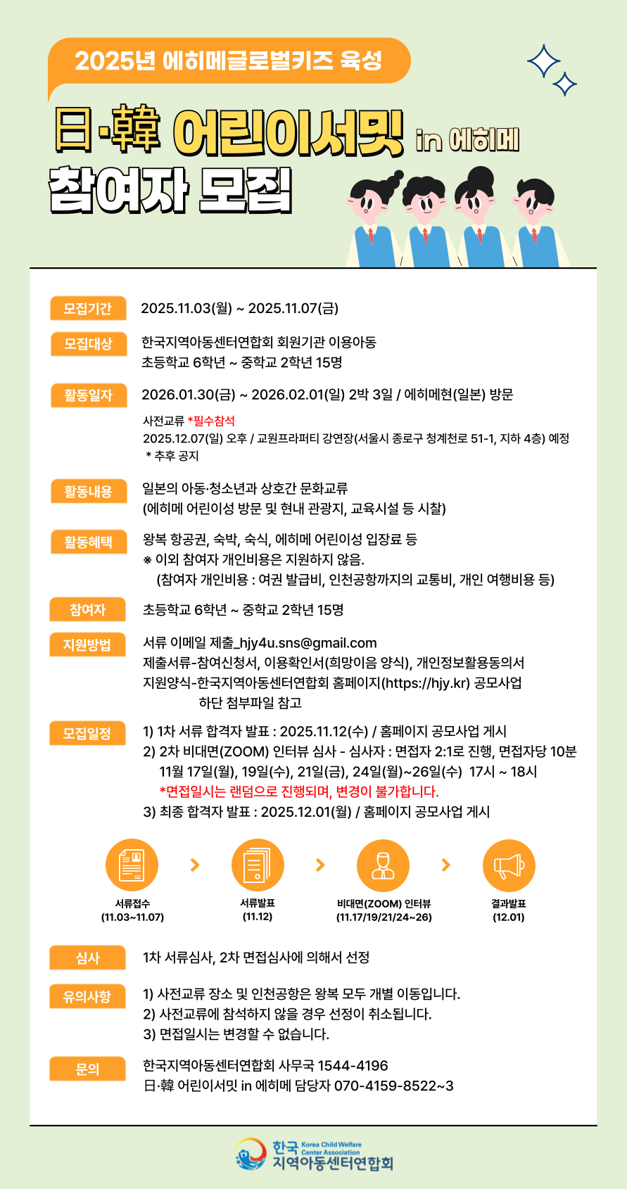 일본 에히메현에서 열리는 2025 日·韓 어린이서밋 in 에히메(2025 日韓児童サミット in 愛媛)에 참가한다.