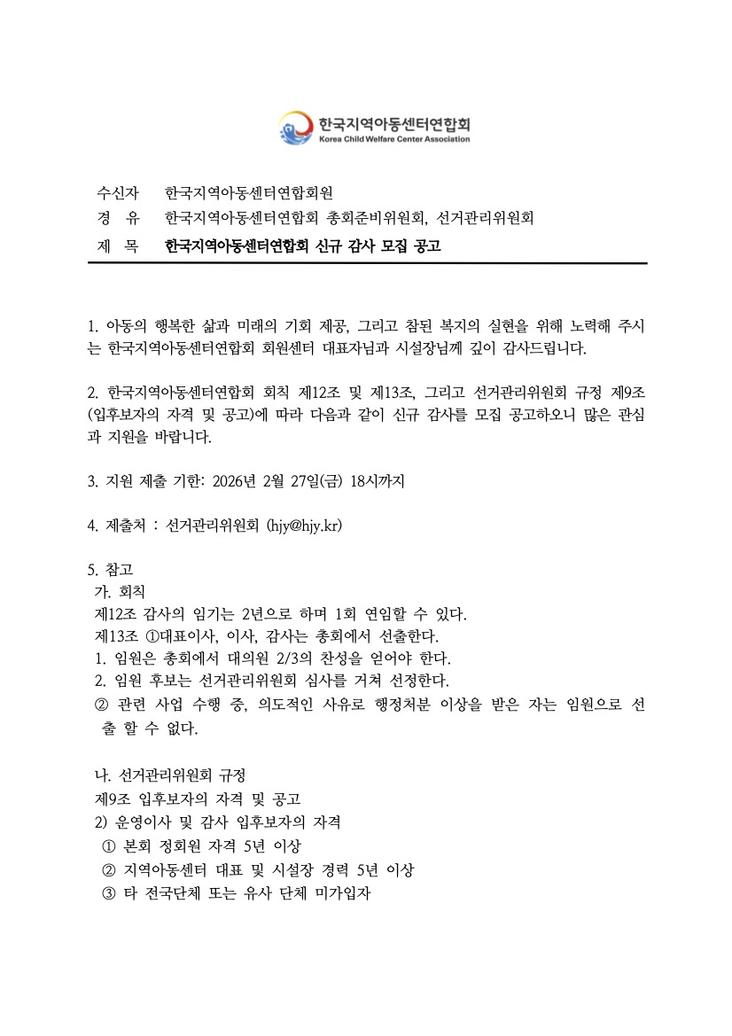 [선거관리위원회] 한국지역아동센터연합회 신임 감사 모집 공고